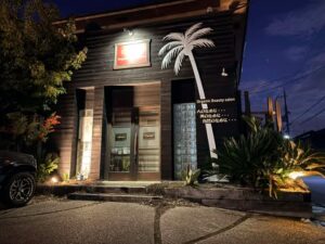 店頭前の大きなヤシの木が目印の美容室